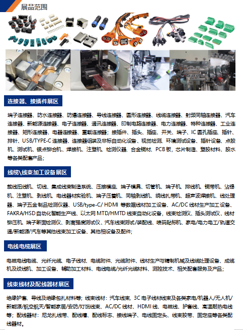 端子連接器、防水連接器、防爆連接器、導(dǎo)線連接器、圓形連接器、線纜連接器、射頻同軸連接器、汽車連接器、新能源連接器、電子連接器、通訊連接器、印制電路連接器、電力連接器、特種連接器、工業(yè)連接器、矩形連接器、電腦連接器、重載連接器;接插件、插頭、插座、開關(guān)、端子、IC圓孔插座、插針、排針、USB/TYPE - C連接器、連接器組裝及非標(biāo)自動化設(shè)備、視覺檢測、環(huán)境測試設(shè)備、插針設(shè)備、點膠機、測試機、銀點鉚合機、焊接機、注塑機、檢測儀器、合金鋼材、PCB板、芯片制造、塑膠材料、膠水等各類配套產(chǎn)品;