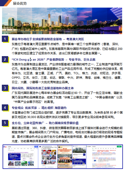 “2026第17屆東莞國際連接器、線纜線束及加工設(shè)備展覽會”將于2026年03月08 - 10日在廣東現(xiàn)代國際展覽中心(東莞厚街)舉辦。展會緊緊依托東莞作為粵港澳大灣區(qū)制造業(yè)C位的區(qū)位優(yōu)勢及雄厚、齊全的制造業(yè)基礎(chǔ),全方位助力企業(yè)開拓新興市場,開啟大灣區(qū)深圳、東莞兩地聯(lián)動戰(zhàn)略,提供更具規(guī)模和品質(zhì)的行業(yè)平臺。